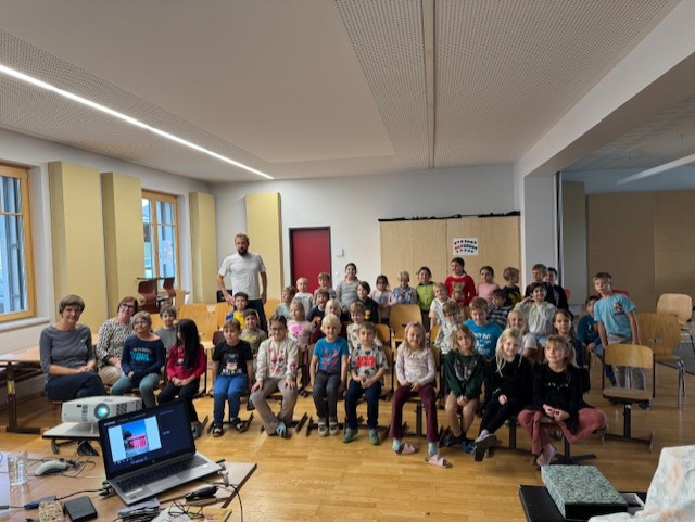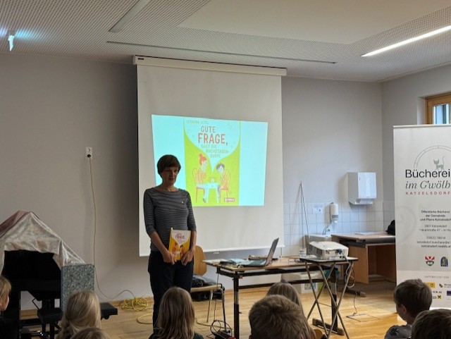 „Gute Frage, sagt die Buchstabensuppe“. Das Buch mit diesem Titel stellte die Autorin und Illustratorin Leonora Leitl am 16. Oktober den Kindern der 1. und 2. Klasse im Mehrzweckraum der Volksschule vor.